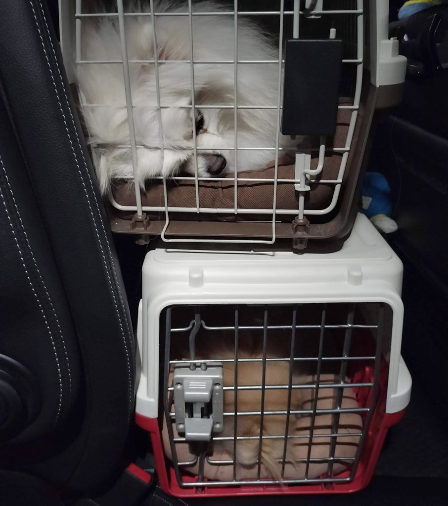 地震の直後に津波警報が出たため、クレートにぽぽちとぱぴちを放り込んで、車で高台に避難しました。