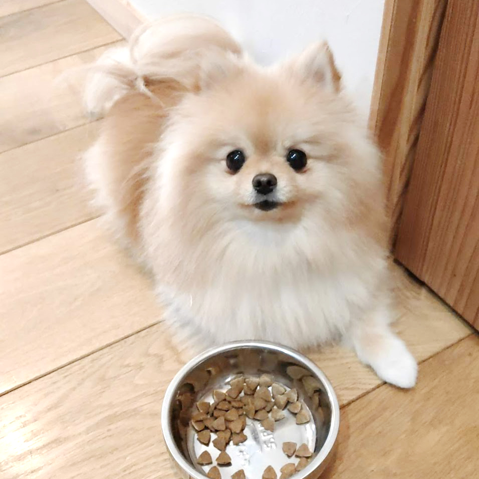 ぽぽちは1.6〜1.7kgなので、1.6gくらいになるように朝晩2回にわけて与えています。