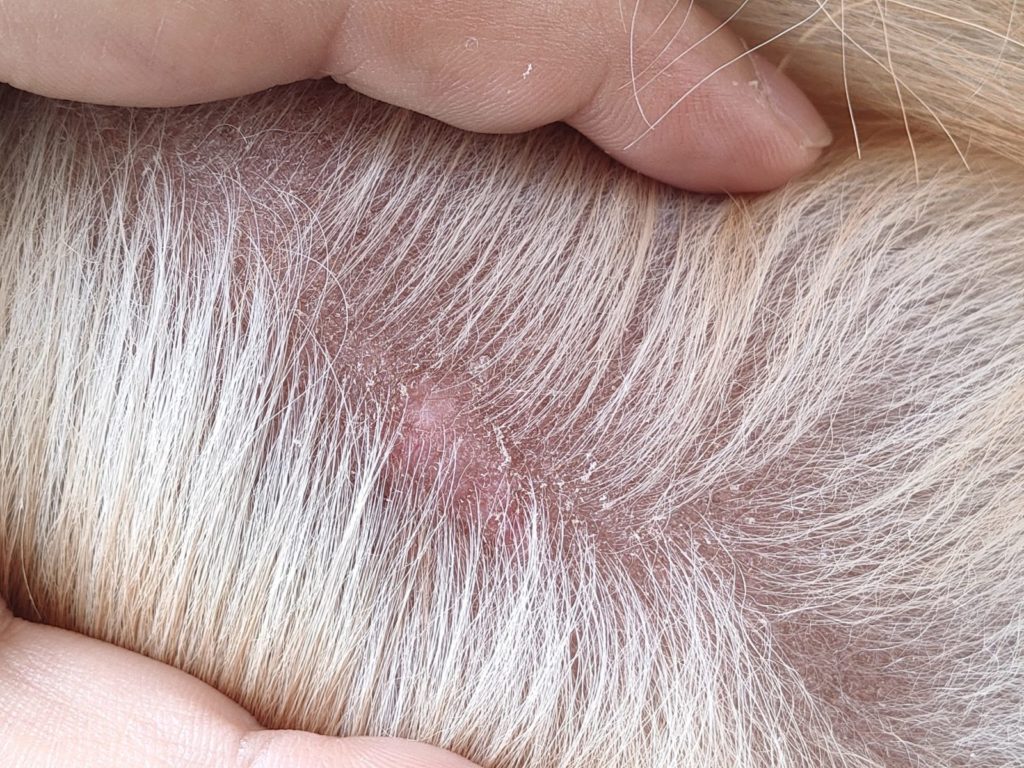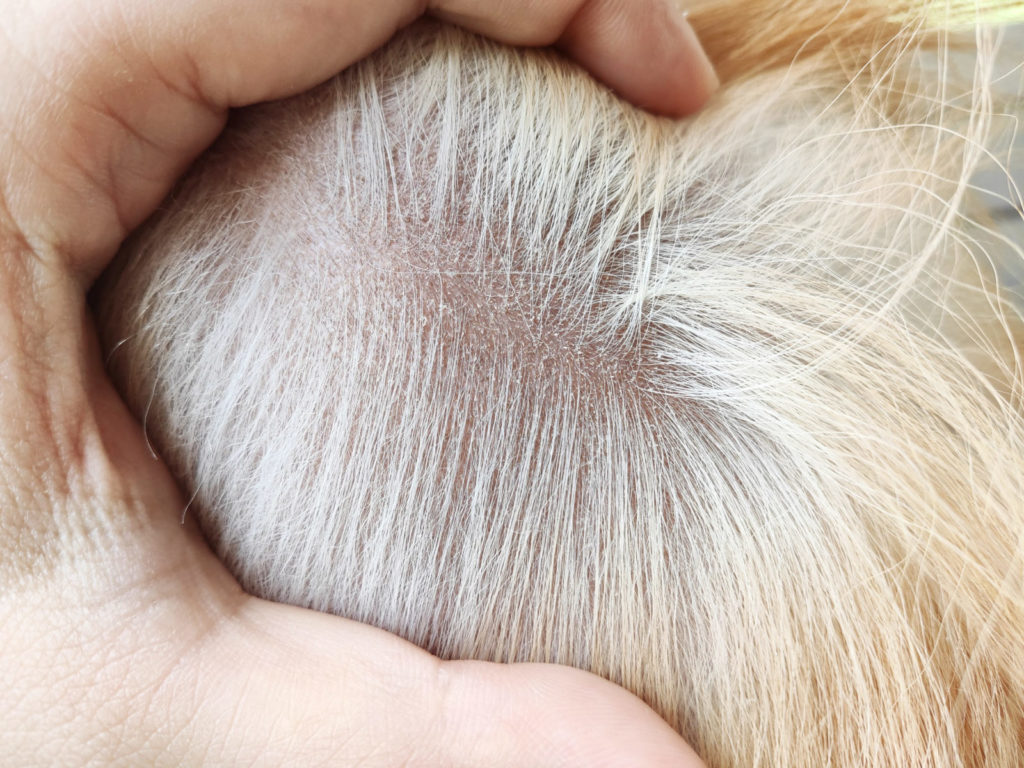 そして、ハゲているお腹をジッと覗き込むと…皮膚の代謝が進んでいるのかポロポロとフケが出ているのに混じって、