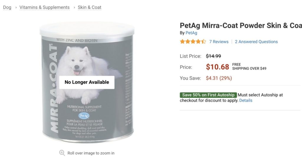 アメリカのペット系ECサイト「chewy」で「miracoat」と検索した結果…「No Longer Available(在庫切れ)」