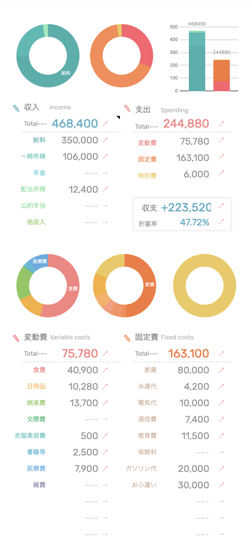 食費・消耗品・娯楽費など費目別の推移をカラフルなグラフで表示。使いすぎがすぐわかる。