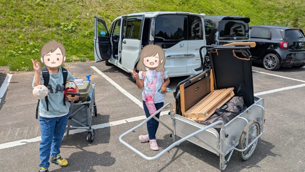サイトに車の横付けができないので、キャンプ場で貸してくれるリアカーで道具を運ぶ必要があります。