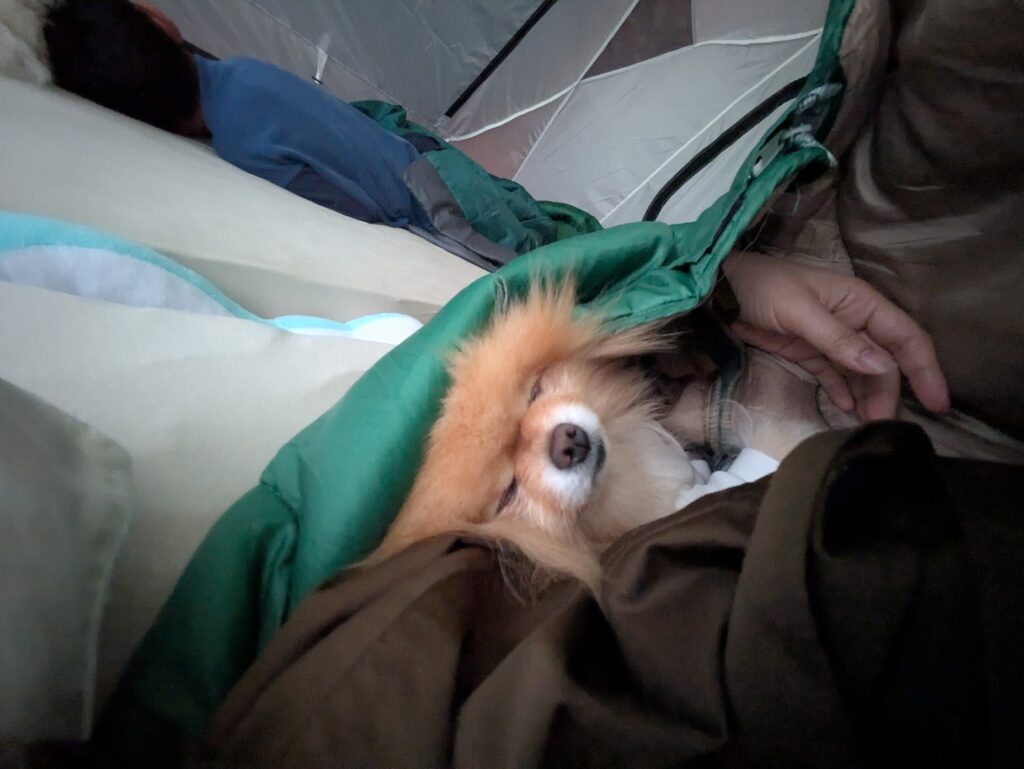 お犬たちはテント内で、自分たちの置き入りの場所でぐっすり眠っていました。