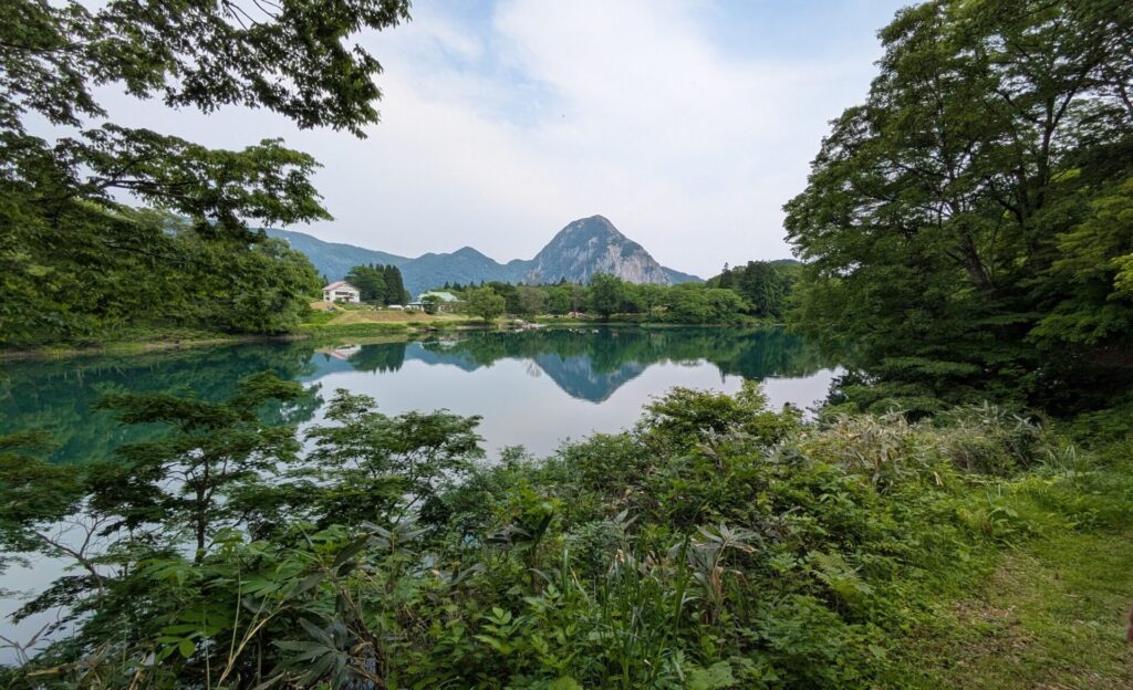 池越しに見える雄大な山の景色は圧巻で、朝の澄んだ空気の中でのんびり歩くのにぴったりです。