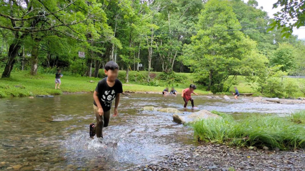 キャンプ場内を流れる小川「さかさ川」は、子どもでも安心して遊べる浅瀬のスポットです。冷たくて澄んだ水に足を浸すだけでも癒され、我が家の子どもたちも大はしゃぎでした。
