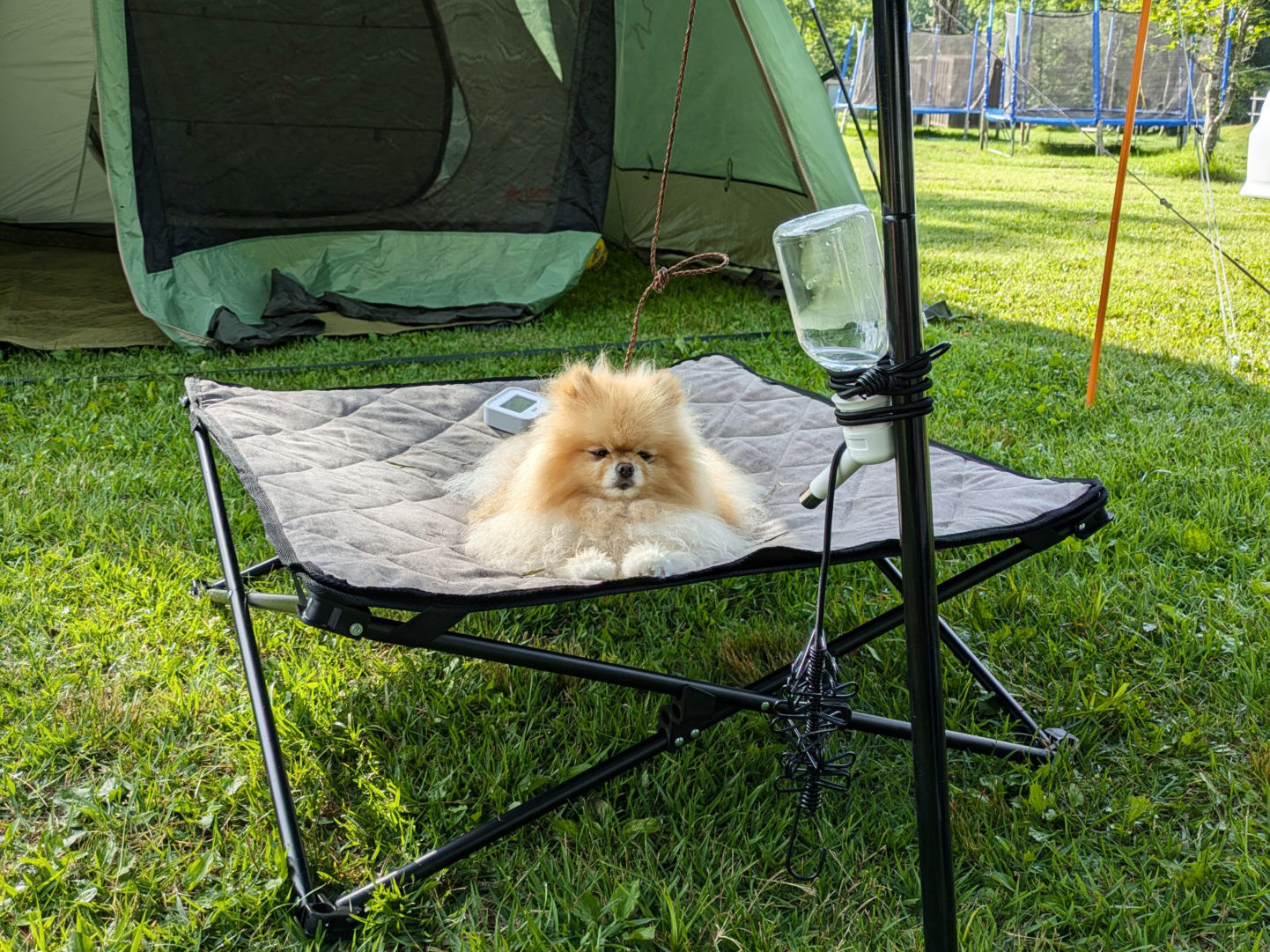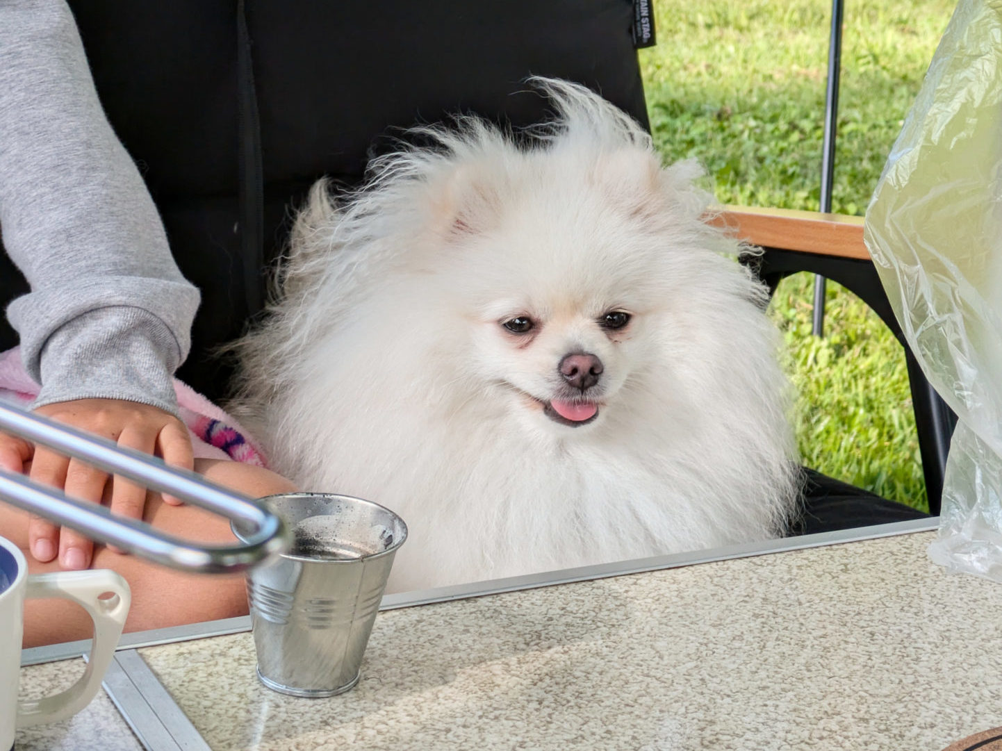 一方のぱぴちはというと、コットでまったりよりも人のそばにいたい派。 周りのにおいをかぎながら少しウロウロしていたものの、ぽぽちと一緒に寝るよりも、子どもたちが座っているベンチに自ら加わって一緒に座る場面が多く見られました。 キャンプを満喫というよりは、抱っこしてほしかったり、ご飯のおこぼれを期待していたのかもしれません(笑)